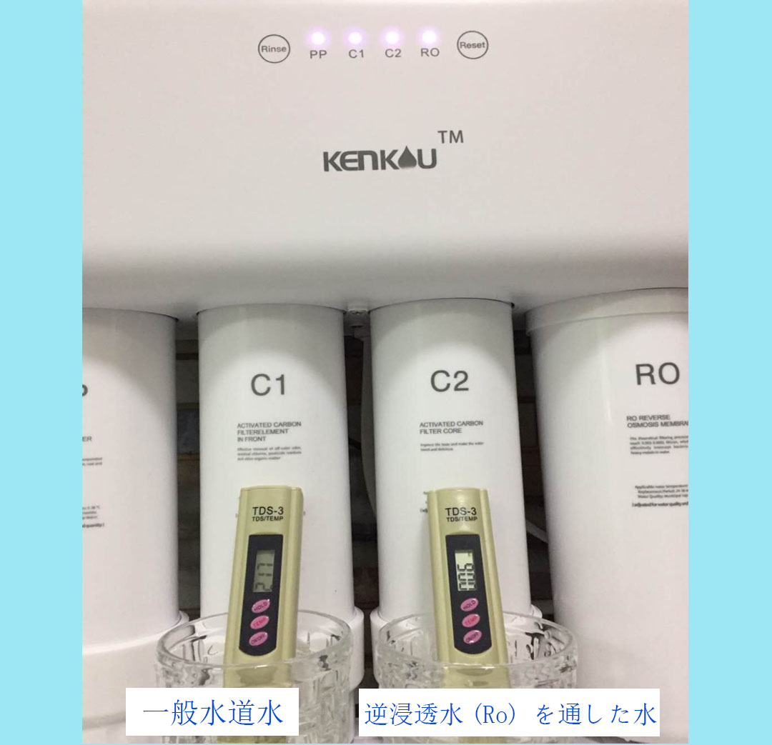 元々、海水から真水を造る為に開発された逆浸透膜式の浄水器は水に完全に溶けてイオン化した不純物も95%の高率で分離除去する事が可能です。